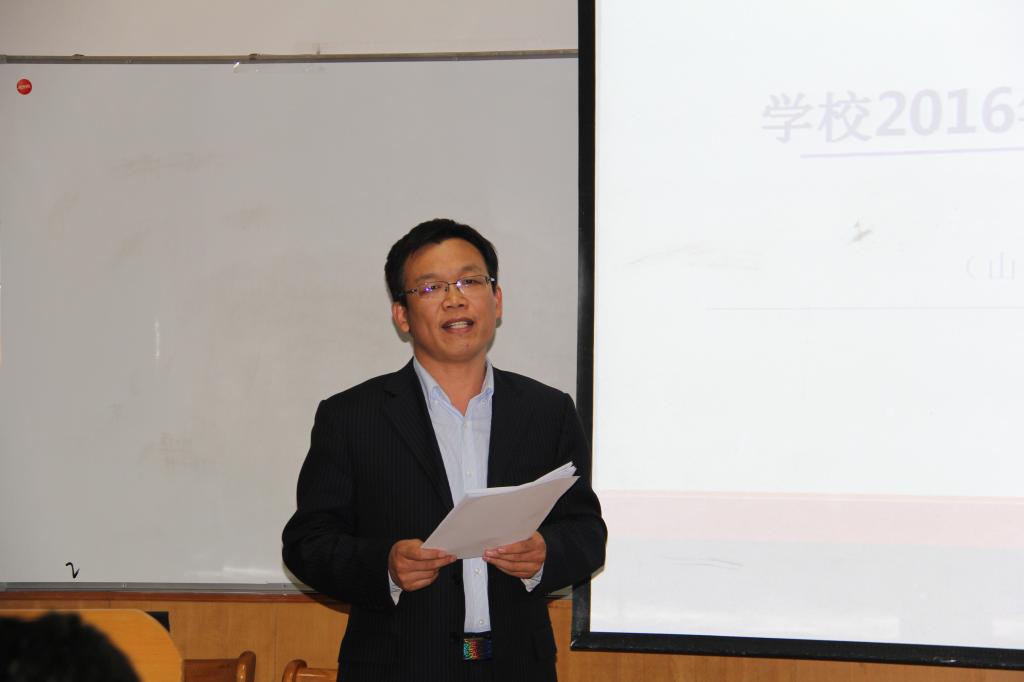 会上,院长史建红通过PPT方式,比较详细地从人事管理、科研及学科建设、教学及人才培养等三方面介绍了学校2016年度改革发展的新举措,号召学院教职工要以积极进取的心态,立足当下,真抓实干,锐意进取。通过史建红院长的介绍,使大家感受到了学校推进全面综合改革的热情,激发了大家“等不得、拖不得、慢不得”的紧迫感、责任感。