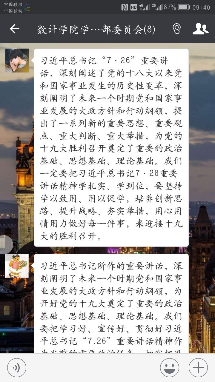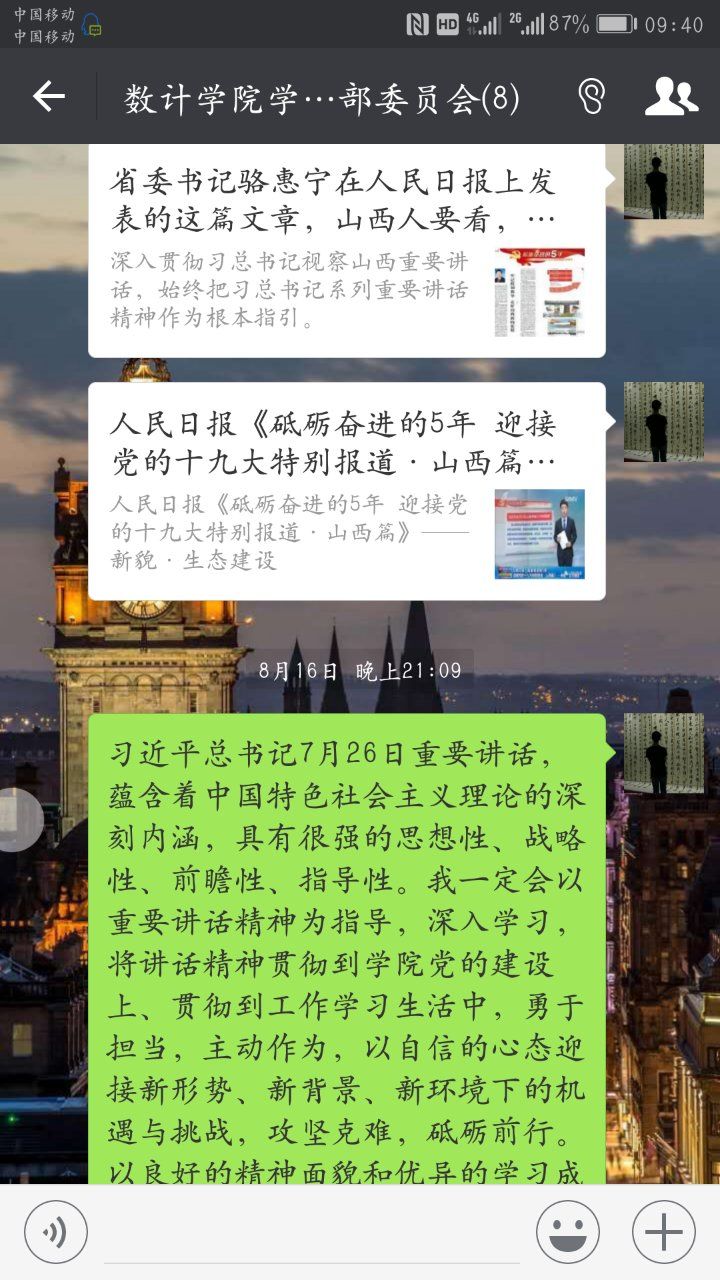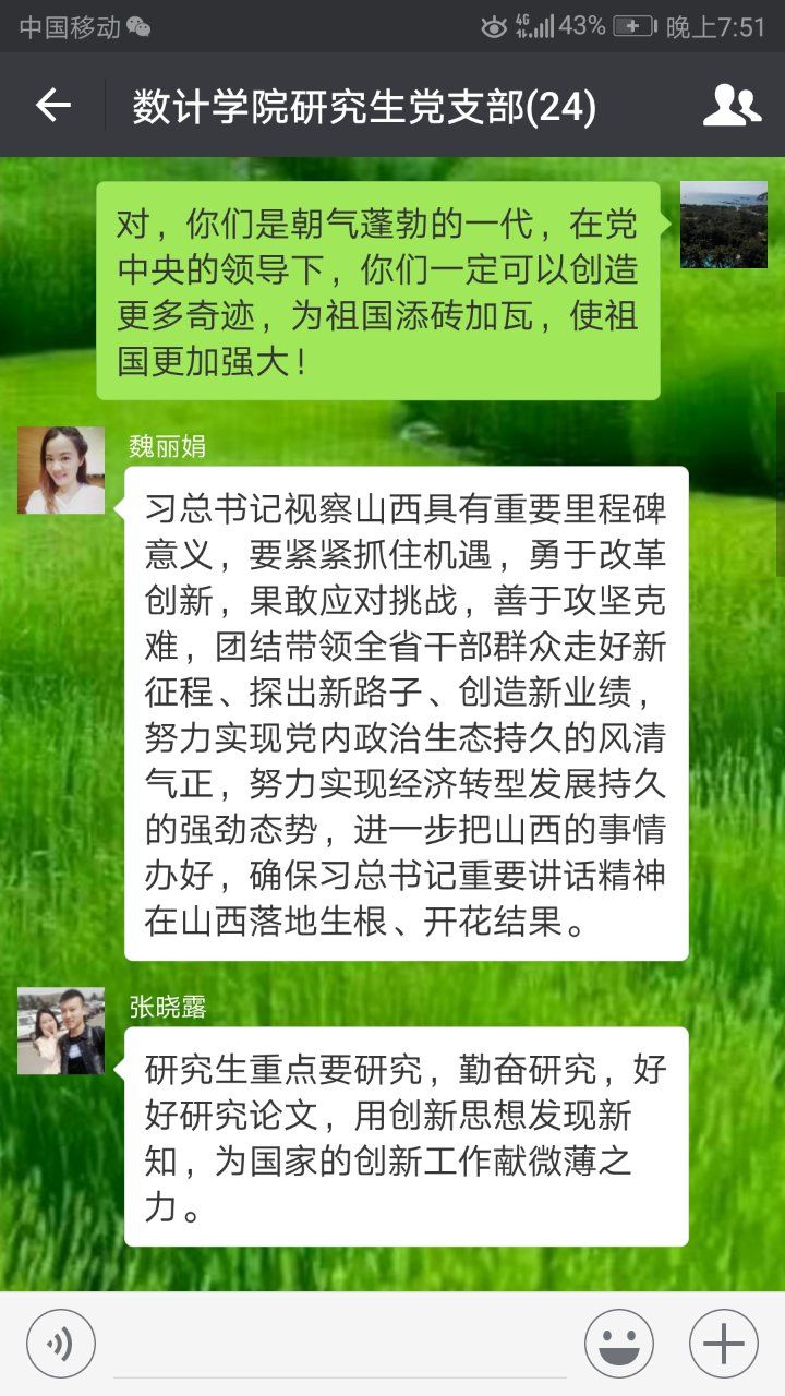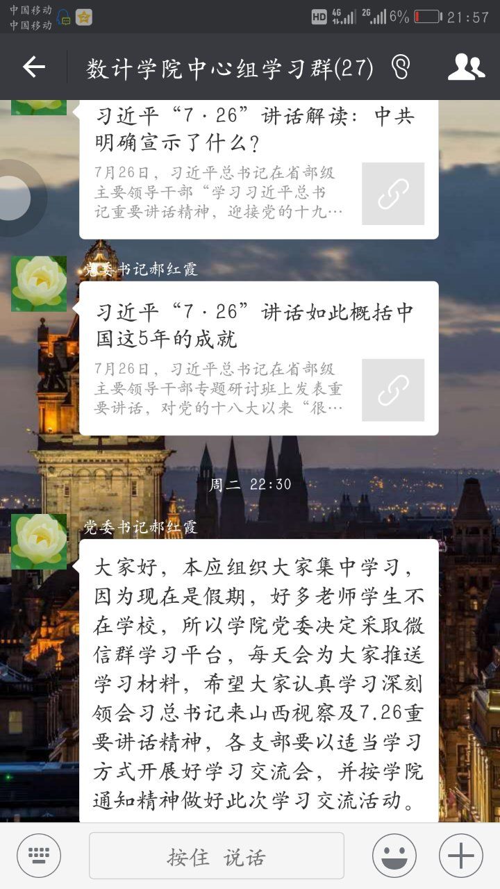 院党委通过yl23411永利官网中心组微信学习群和各党支部微信群,每天推送学习专题,党员干部带头对讲话精神进行深入解读,交流学习心得。各党支部书记主持开展本支部的学习交流会,每位党员结合自身的工作和实际,在群里谈心得,讲体会。大家一致表示,要自觉维护以习近平同志为核心的党中央的权威,牢固树立“四个意识”,不断增强“四个自信”,要把讲话精神融入到教学科研、人才培养的各项工作中,落实到行动上。