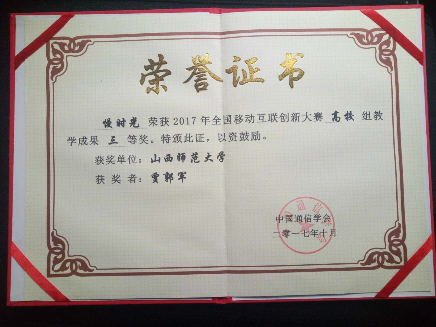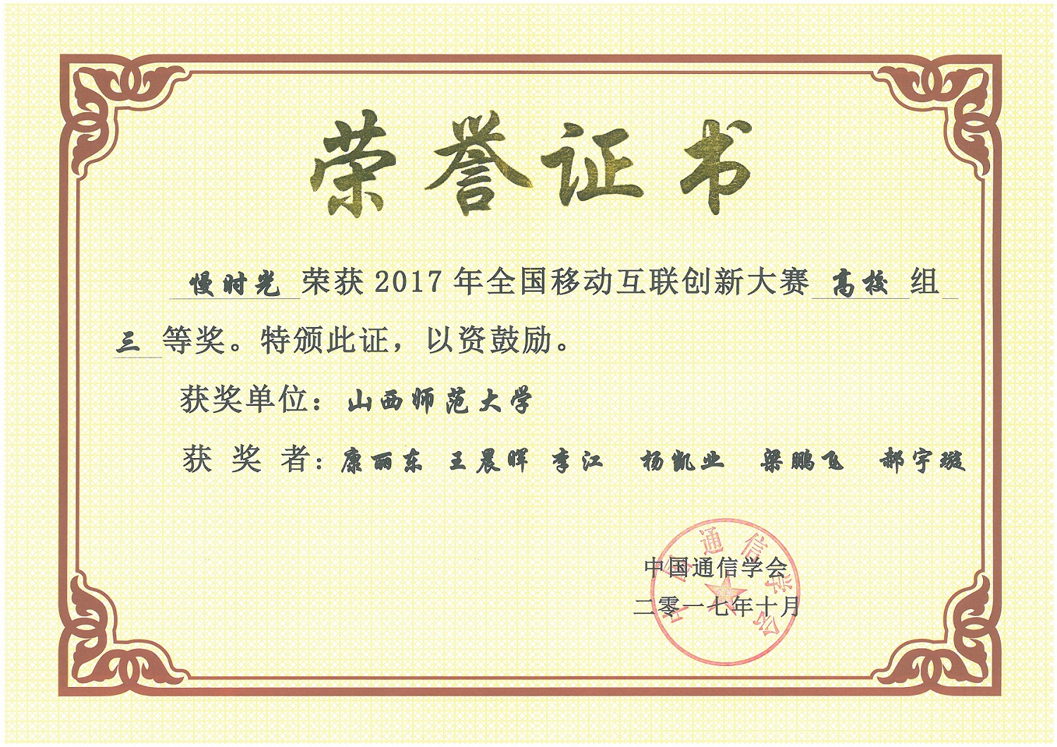 10月27日——29日,2017全国移动互联创新大赛在北京落下帷幕。yl23411永利官网“慢时光”团队作为我校参赛的唯一团队,喜获高校组“三等奖”荣誉,这也是我校首次参加这一全国顶级赛事。
