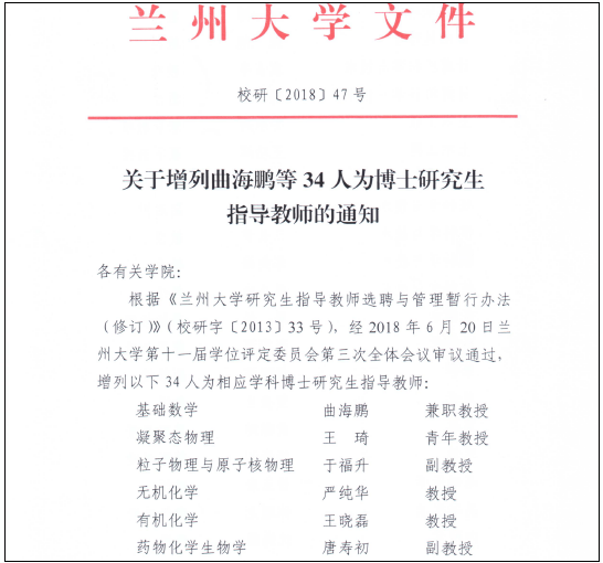 2018年6月20日,兰州大学第十一届学位评定委员会第三次全体会议审议通过,聘我院曲海鹏教授为兰州大学基础数学专业博士研究生指导教师。