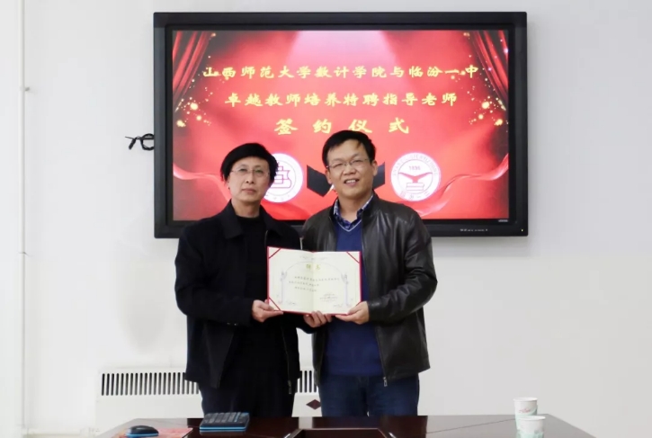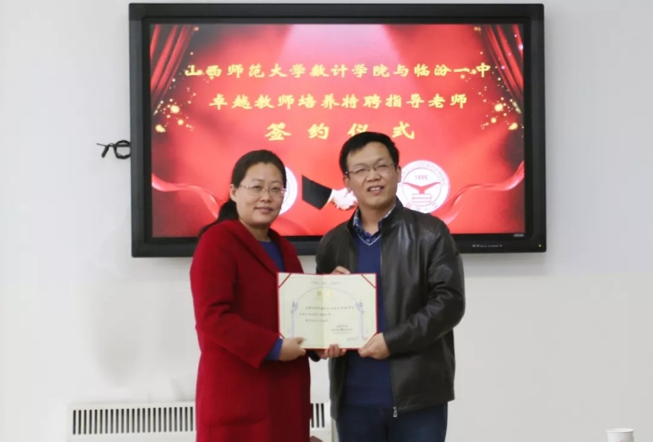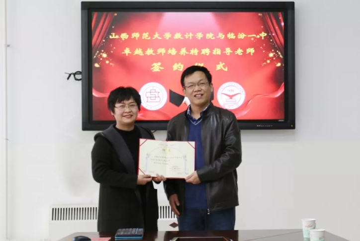 2019年3月11日下午,我院在临汾第一中学校举行“卓越教师培养计划”特聘指导老师签约仪式。院长史建红、副院长朱红康、党委副书记杨亚东及部分学生代表,与临汾一中校长张杨管、副校长陈建平、教导处主任支刚华、刘跃梅老师、古跃宏老师出席了签约仪式。