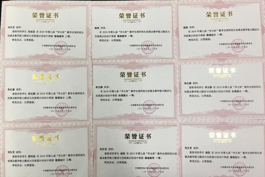 9月26日至29日,由中国教育技术协会微格教学专业委员会主办的2019年数学微格教育论坛暨第九届“华文杯”数学全国师范生创课及教学能力测试与交流展示活动在广西师范大学举行。来自全国近70所院校的300余名数学专业师范生参加比赛,我院6名学子在副院长朱红康、教师刘生芝的带领指导下,经过激烈角逐,最终喜获创课设计与展示和微课教育技能展示共十二个单项奖,其中一等奖3项,二等奖7项,三等奖2项。