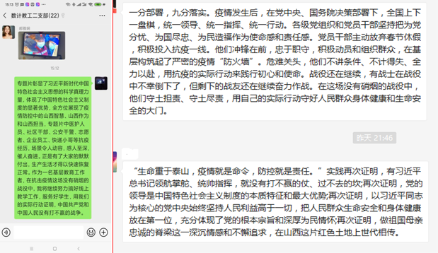 教师党员围绕“强化责任担当,弘扬‘战疫’精神”主题进行了线上讨论,纷纷表示要树牢“四个意识”,坚定“四个自信”,大力弘扬“战疫”精神,不忘立德树人使命,履职尽责,凝心聚力,为学院申博、学科建设、学科评估等重心工作服务,为学校改革发展和走好新时代山西高质量转型发展新征程贡献力量。