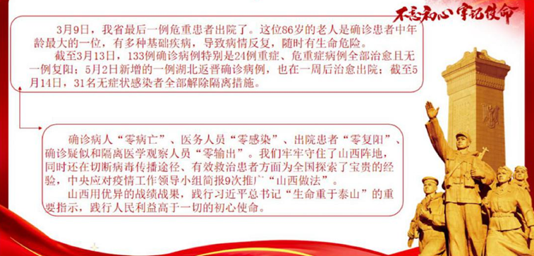 6月8日晚,电视专题片《用忠诚担当书写勇毅前行的山西答卷——新冠肺炎疫情防控斗争启示录》在山西卫视播出。按照学校党委宣传部的要求,yl23411永利官网党委立即安排,第一时间在微信群内通知师生收看,通过新媒体平台进行宣传,并组织七个党支部的师生党员通过收看直播、支部集中学及线上热议交流的形式进行了观看学习。