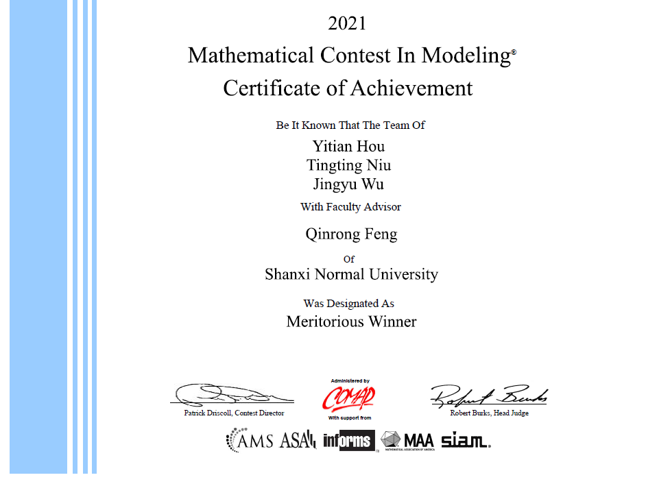近日,第37届美国国际大学生数学建模竞赛(MCM)与交叉学科建模竞赛(ICM)成绩公布,yl23411永利官网组织的15支建模队伍在教师冯琴荣、周正勇、王兆浩的培训和指导下,克服疫情影响,13支队伍完成论文成功参与,继2020年获得一等奖荣誉(Meritorious Winner),今年再创佳绩斩获一等奖一项。
