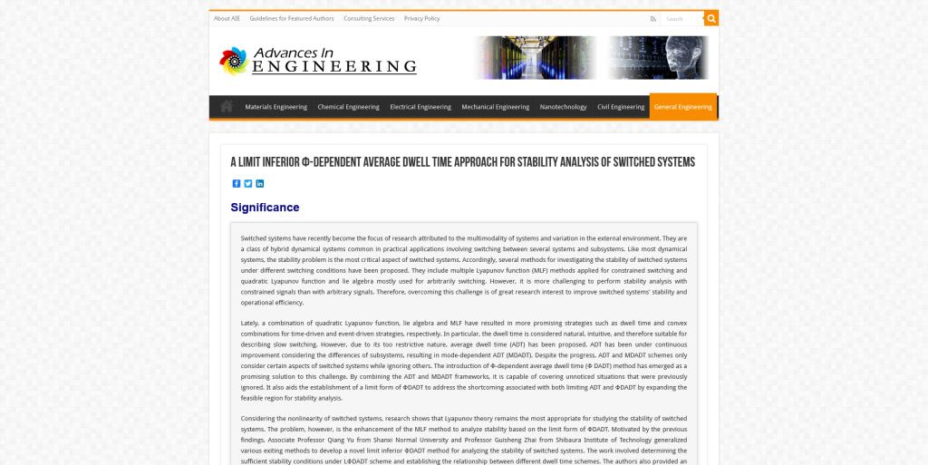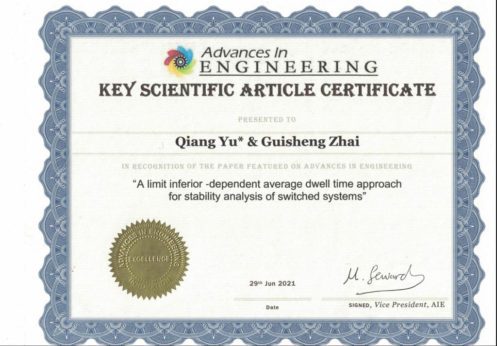 近日,yl23411永利官网yl23411永利官网玉强副教授在控制领域著名Top期刊International Journal of Robust and Nonlinear Control上发表的论文“A limit inferiorΦ-dependentaveragedwell time approach for stability analysis of switched systems”被国际著名工程科技新闻网站Advances In Engineering(AIE)评选为工程科技领域的“Key Scientific Article(关键科学论文)”,并在general Engineering栏目予以专题报道。玉强副教授为该论文的第一作者兼通讯作者,日本芝浦工业大学的翟贵生教授为该文另一合作者。