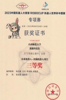 8月24日,由中国自动化学会主办,中国自动化学会机器人竞赛与培训部、中国自动化学会机器人竞赛工作委员会、北京工商大学承办的2023中国机器人大赛暨RoboCup机器人世界杯中国赛专项赛在北京工商大学良乡主校区开幕。我院龙骧科技队在“农业机器人-节水灌溉机器人项目”中荣获三等奖,龙骧科技队与布里茨两支队伍在“农业机器人-采摘机器人项目”中荣获三等奖与优秀奖。