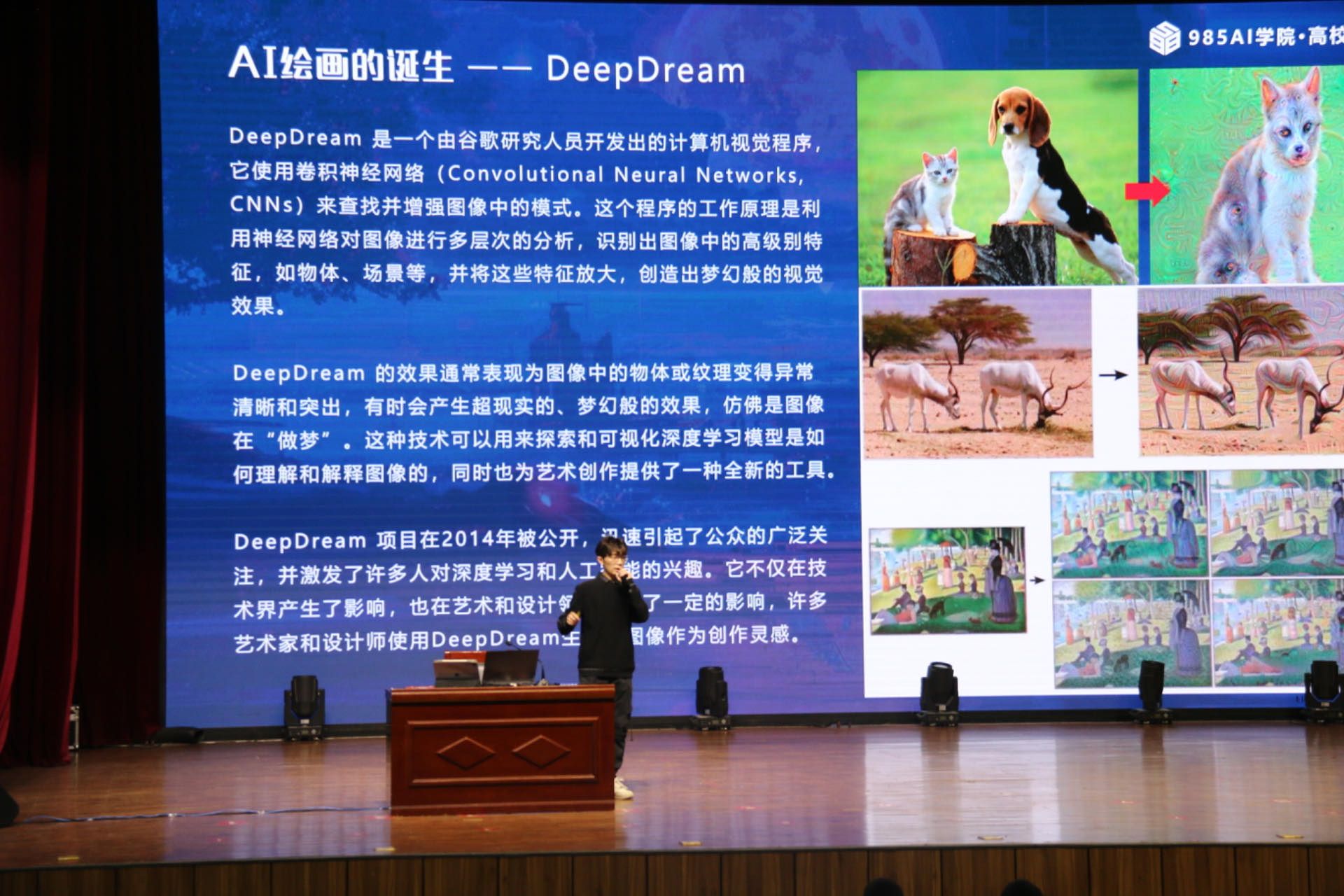 董艳伟介绍了AI的基本概念和发展历程,分享了AI技术工具、AIGC的实际应用场景及案例,并通过现场实操演示AI在文案撰写、PPT制作等方面的应用。李云博讲解了AI绘画的发展和运用,并进行Midjourney与Stable Diffusion技术实操。随后,两位主讲人与同学们就如何优化AI交互设计、如何利用AI助力创新创业等问题进行交流。