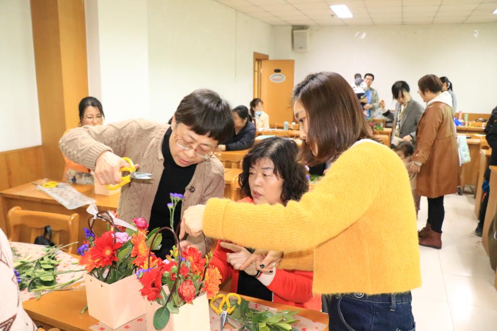 活动伊始,花艺师为女教师们讲解了花艺的分类和插花的原则。插花艺术和绘画、建筑、雕塑等等是相通的,插花中要注意黄金分割比例、色彩、主次关系、平衡等。随后,插花创作拉开帷幕。老师们用鲜花精心设计创作,巧手翻飞系蝴蝶结、剪枝、插花,现场欢声笑语不断,气氛轻松愉悦。一枝花、一棵草,在教师们的巧手下变的诗情画意、格调高雅、清新怡人。活动结束后,女同志们提着自己亲手制作的花篮合影留念。