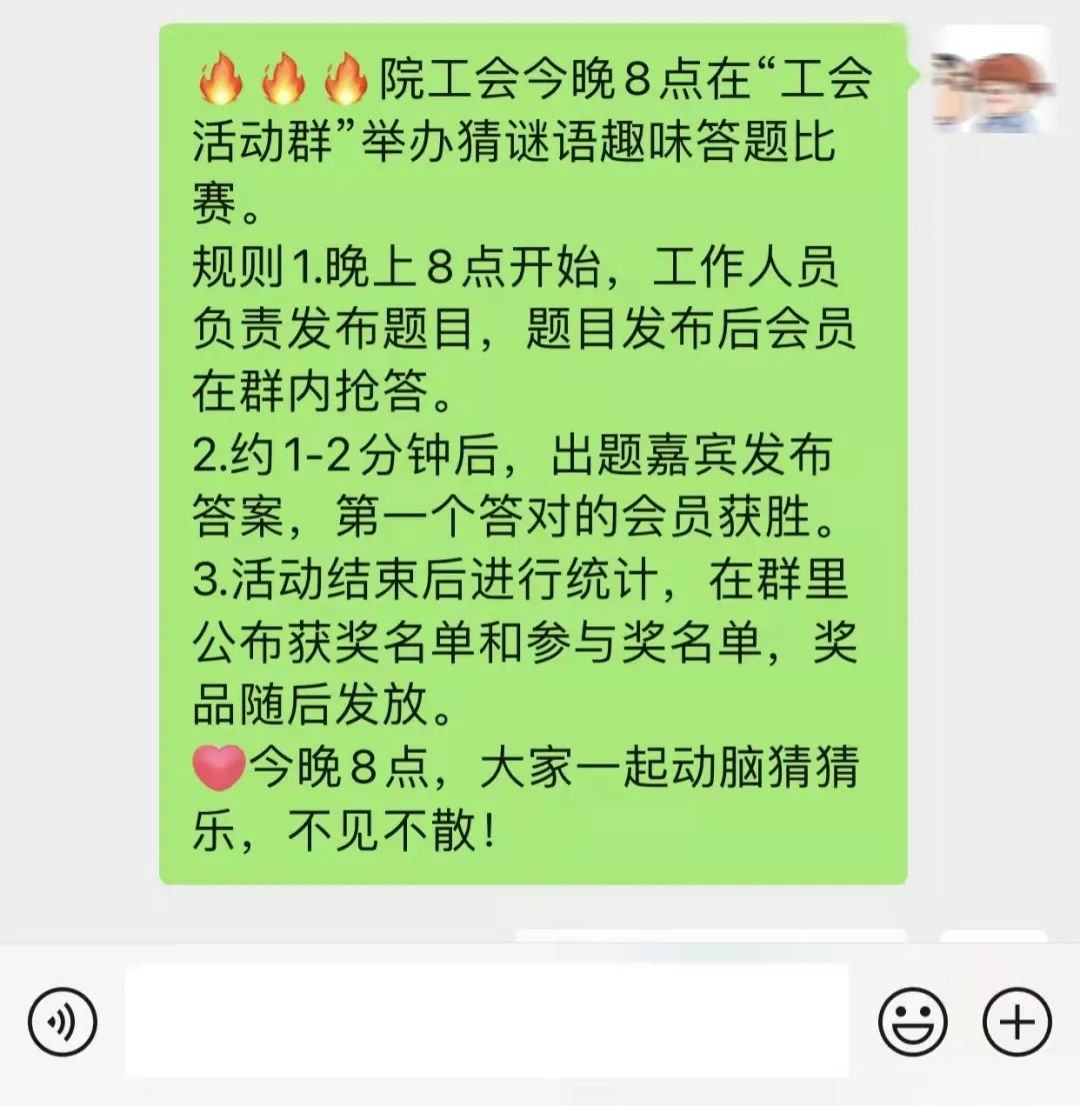 阳春三月,乍暖还寒中,yl23411永利官网的女教工们又迎来了一年一度的“三八妇女节”。为庆祝“三八”女神节,院工会于3月7日晚8时举行线上猜谜语趣味答题比赛。