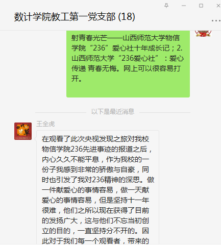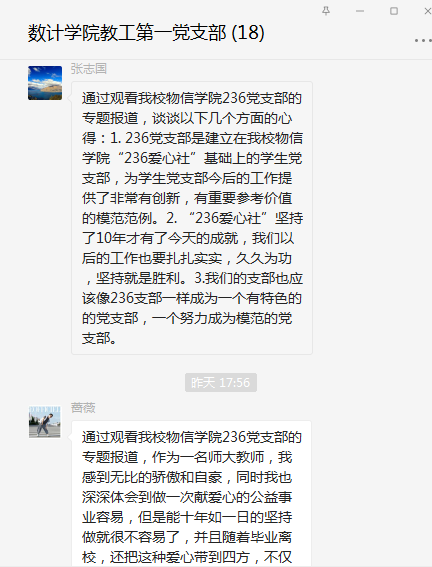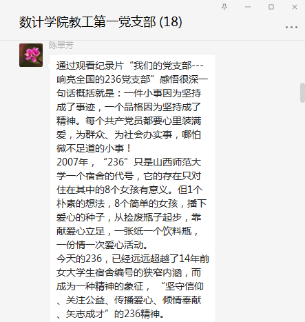 近日,按照校党委组织部的安排,我支部党员自行观看了“百集建党纪录片”《我们的党支部---响亮全国的236党支部》,并在支部群里进行了体会发言和交流讨论。