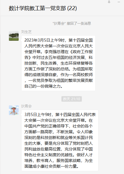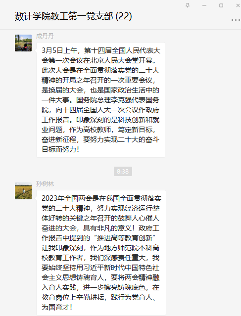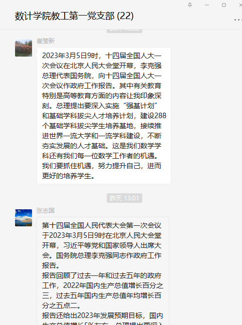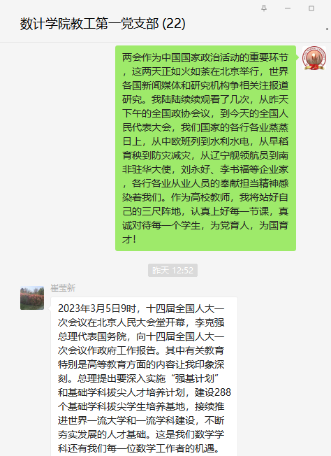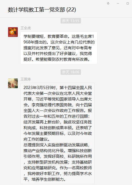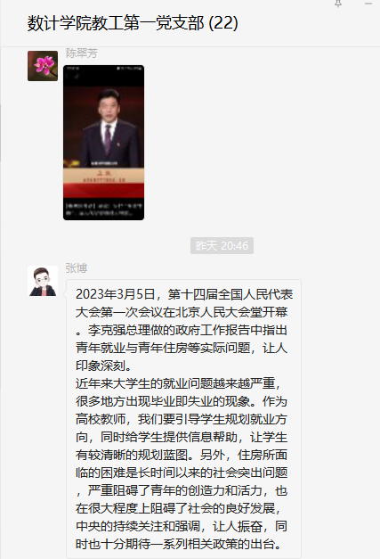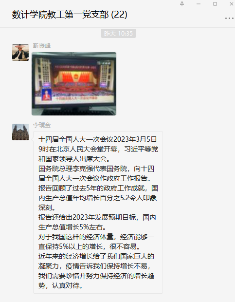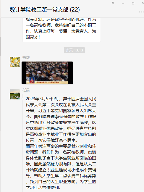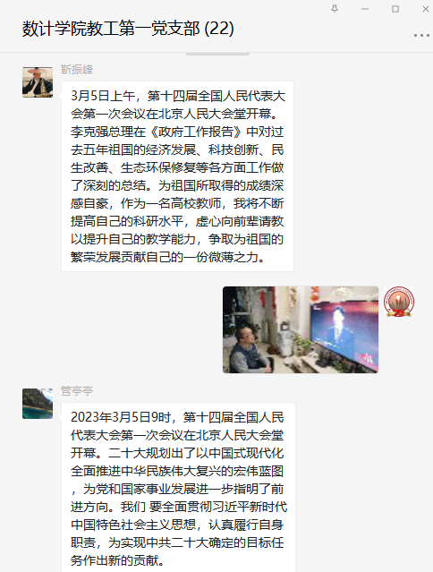 2023年3月4—5日,全国政协十四届一次会议和十四届全国人大一次会议在北京开幕。同时,为积极营造全国两会胜利召开浓厚氛围,中共山西省直属机关工作委员会、山西广播电视台联合制作的大型党建全媒体专题访谈特别节目《奋进赶考路》——山西省教育厅《在新的赶考之路上 奋力书写人民满意的教育答卷》,也于3月4日在山西卫视播出,我支部党员通过网络、电视等方式观看两会开幕和《奋进赶考路》。