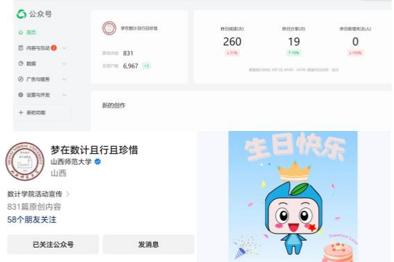 职能:负责运营学院微信平台“梦在数计且行且珍惜”,分享学院动态、活动讲座与通知公告。创作多样原创内容,展现数计er日常,紧跟校园及社会热点。同时负责活动新闻稿、摄影录像、海报设计、文创设计视频剪辑、团讯推送、官网新闻更新及外宣工作,展现学院学子的青春风貌,提升学院的知名度和影响力。